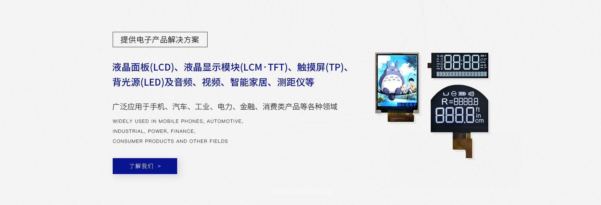專業(yè)設計、生產液晶面板(LCD)、液晶顯示模塊(LCM·TFT)、觸摸屏(TP)、背光源(LED)及音頻、視頻、智能家居、測距儀等